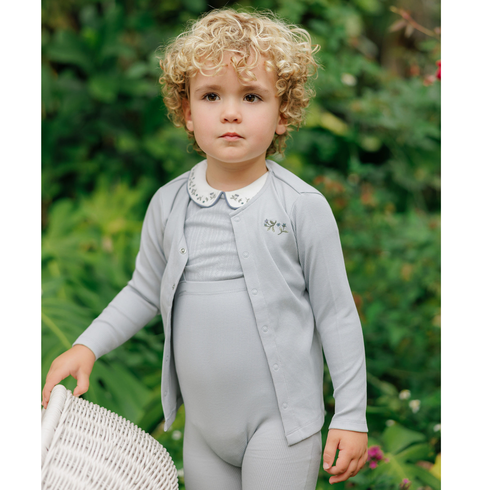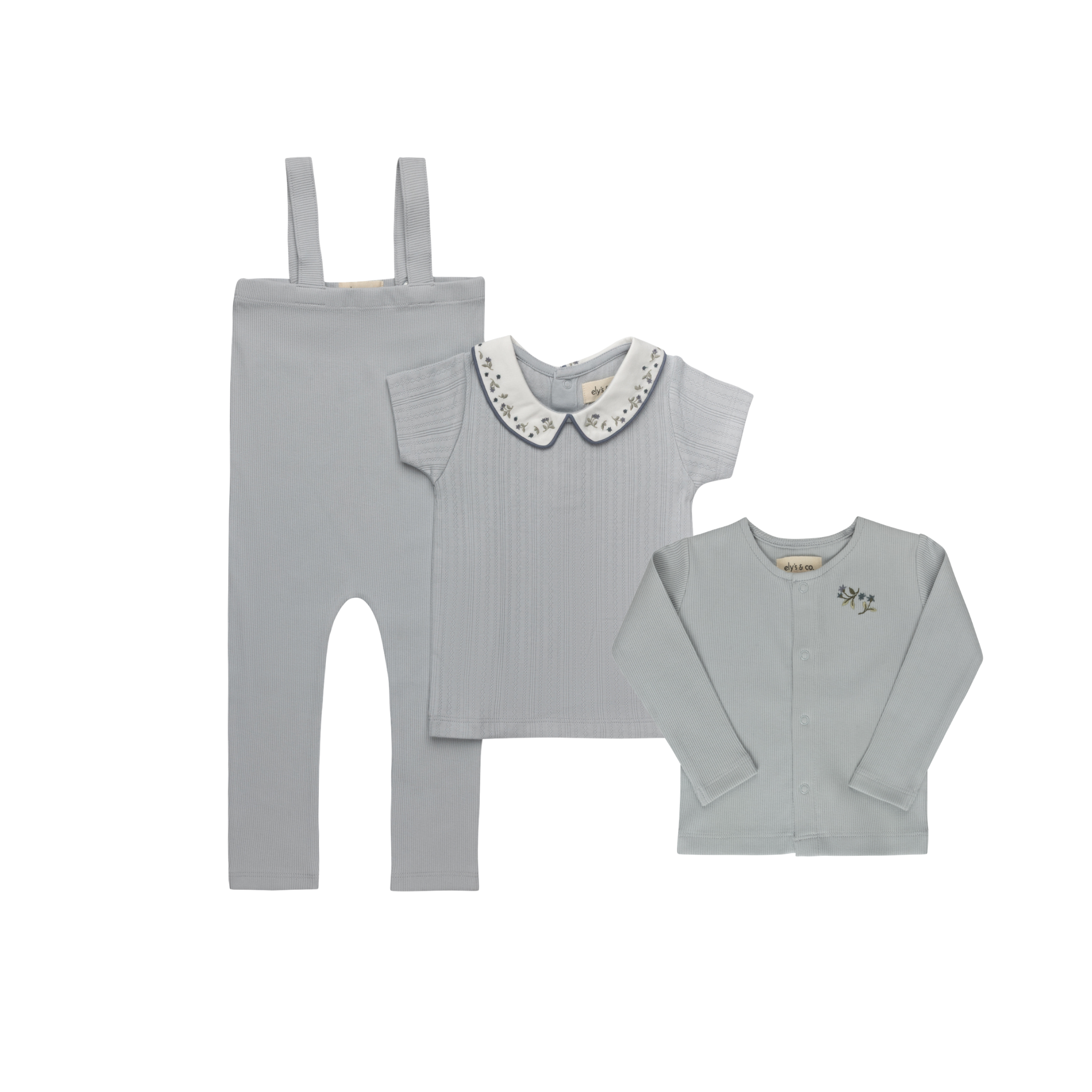 Blue Floral Embroidered Collar Bodysuit, Overalls & Cardigan