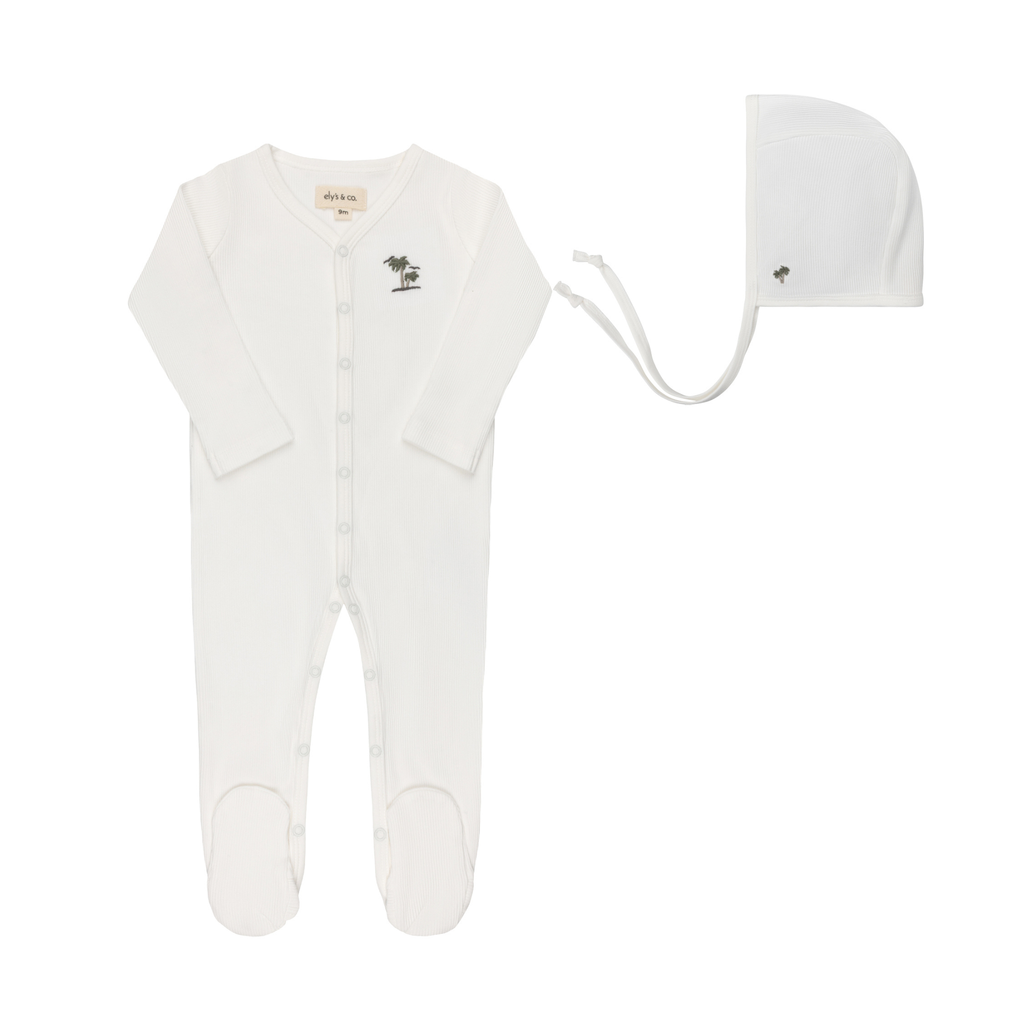 Ivory Ribbed Palm Embroidered Footie and Bonnet