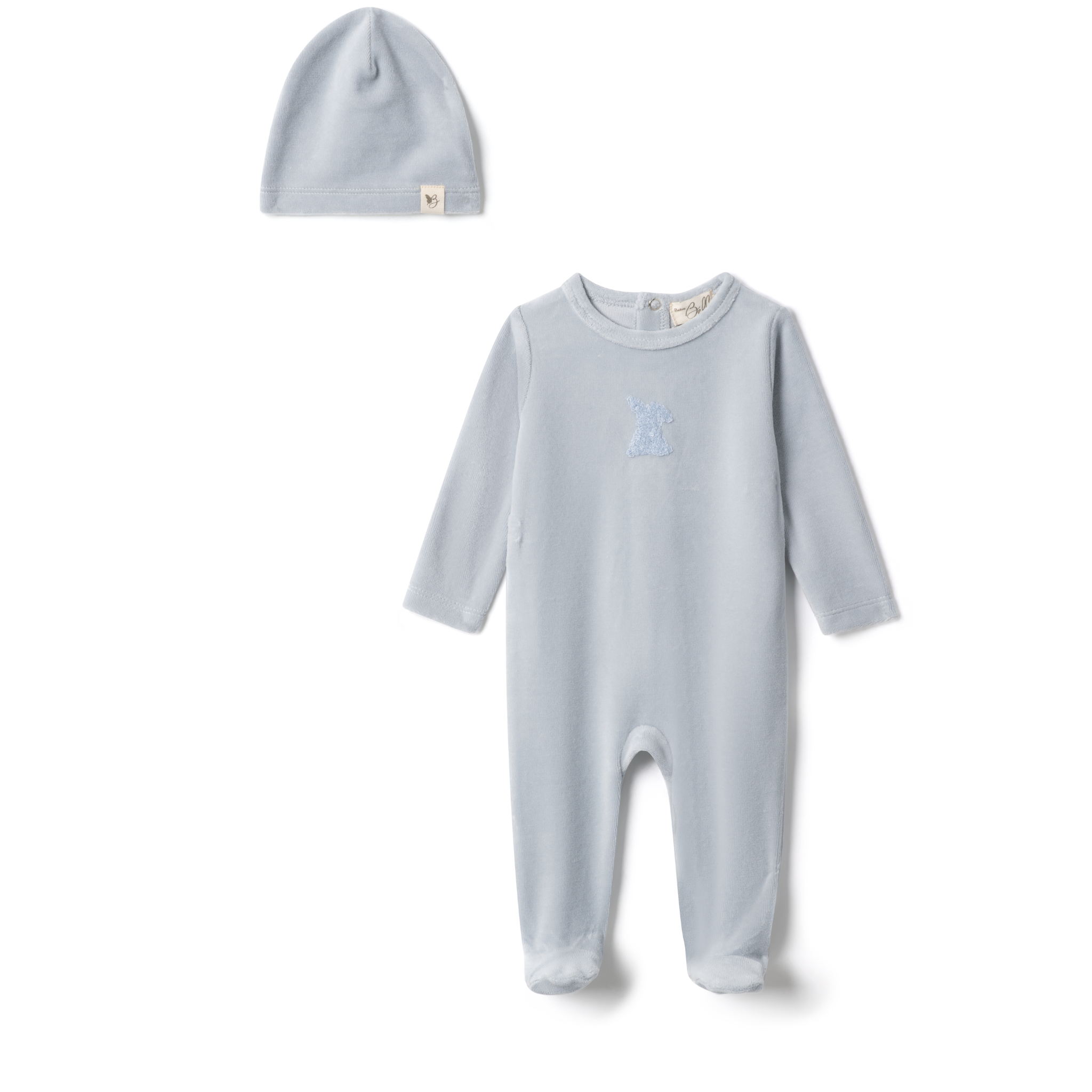 Blue Mist Velour Bunny Applique Footie and Beanie