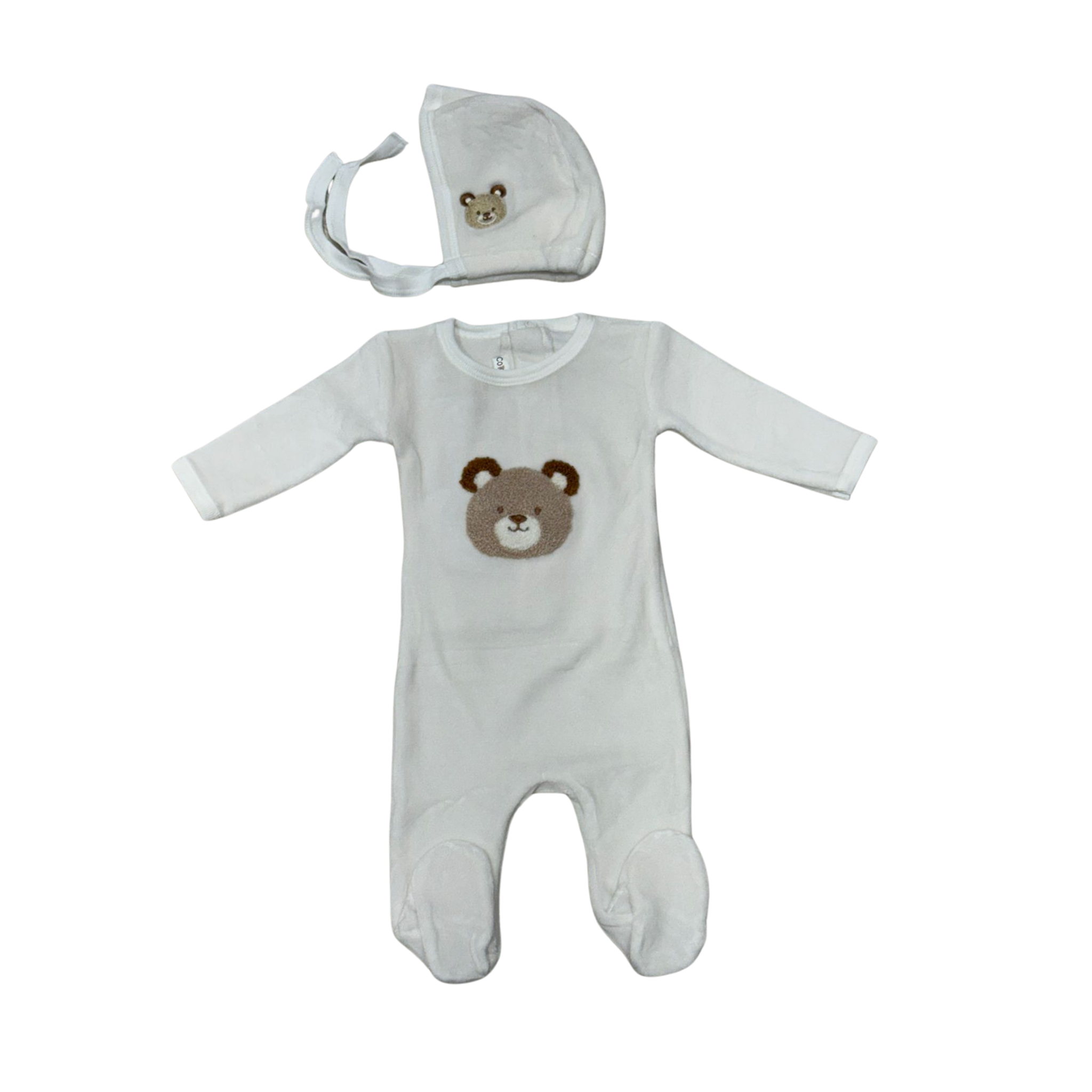 Ivory Lovely Teddy Velour Footie and Bonnet